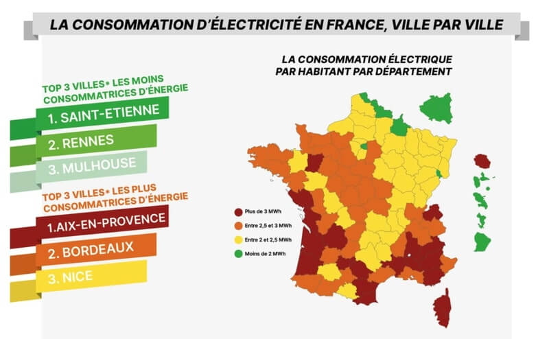 Si on n’ira pas accuser certaines régions de nos malheurs en matière d’énergie — ce qui n’aurait de toute façon aucun sens —, il est drôle de noter que les départements qui consomment le plus ne sont pas forcément celles que l’on suspecterait. Il s’agit de : les Alpes-de-Haute-Provence, l'Aude, la Charente-Maritime, la Corse-du-Sud, la Dordogne, la Drôme, la Gironde, la Haute-Corse, les Landes, la Mayenne, le Tarn, le Var, la Haute-Savoie, les Hautes-Alpes, les Pyrénées-Orientales, le Tarn-et-Garonne, la Vendée et le Gard.